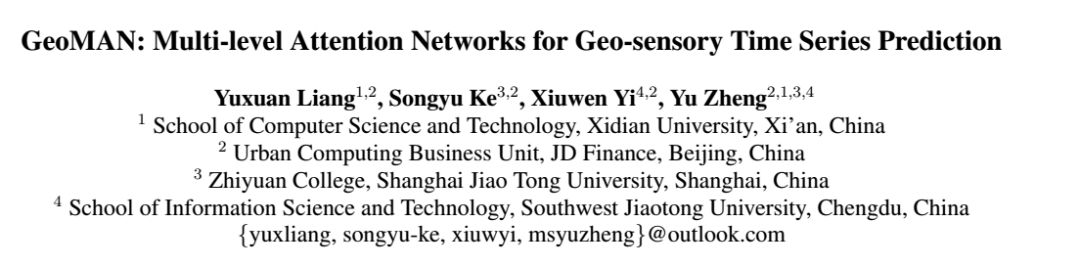 近日,郑宇向机器之心透露了团队的一项最新突破与进展——京东金融城市计算业务部的一篇论文《GeoMAN:Multi-level Attention Networks for Geo-sensory Time Series Prediction(基于多层注意力机制神经网络的地理传感器时间序列预测)》被人工智能领域国际顶级学术会议 IJCAI 2018 录用。