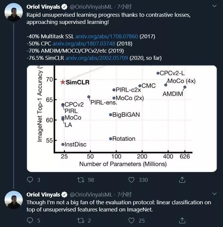 无监督学习的快速发展让科学家们看到了新的希望,DeepMind 科学家 Oriol Vinyals 表示:感谢对比损失函数,无监督学习正在逼近监督学习!