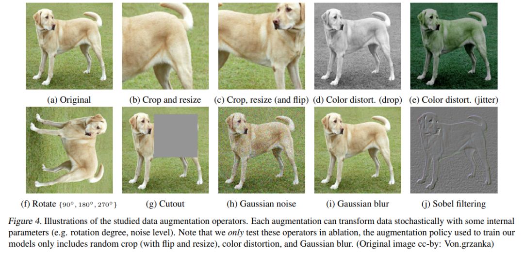多种数据增强操作的组合是学习良好表示的关键。图 4 显示了作者在这项工作中探讨的数据增强。