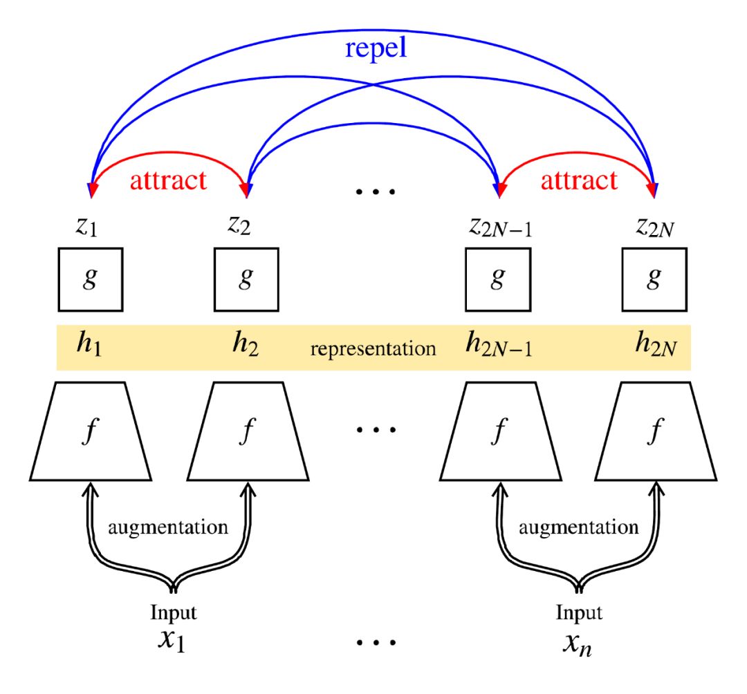 受到最近对比学习算法(contrastive learning algorithm)的启发,SimCLR 通过隐空间中的对比损失来最大化同一数据示例的不同增强视图之间的一致性,从而学习表示形式。具体说来,这一框架包含四个主要部分: