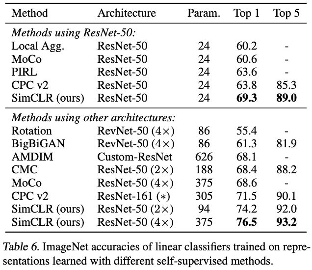 表 6 显示了 SimCLR 与之前方法在线性估计方面的对比。此外,上文中的表 1 展示了不同方法之间更多的数值比较。从表中可以看出,用 SimCLR 方法使用 ResNet-50 (4×) 架构能够得到与监督预训练 ResNet-50 相媲美的结果。