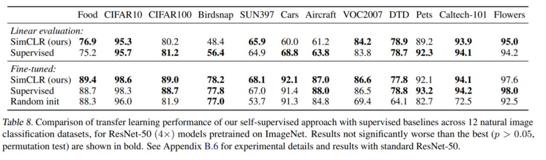 研究者在 12 个自然图像数据集上评估了模型的迁移学习性能。下表 8 显示了使用 ResNet-50 的结果,与监督学习模型 ResNet-50 相比,SimCLR 显示了良好的迁移性能——两者成绩互有胜负。