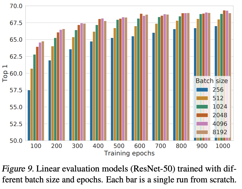 对比学习(Contrastive learning)能从更大的批大小和更长时间的训练中受益更多。图 9 展示了在模型在不同 Epoch 下训练时,不同批大小所产生的影响。