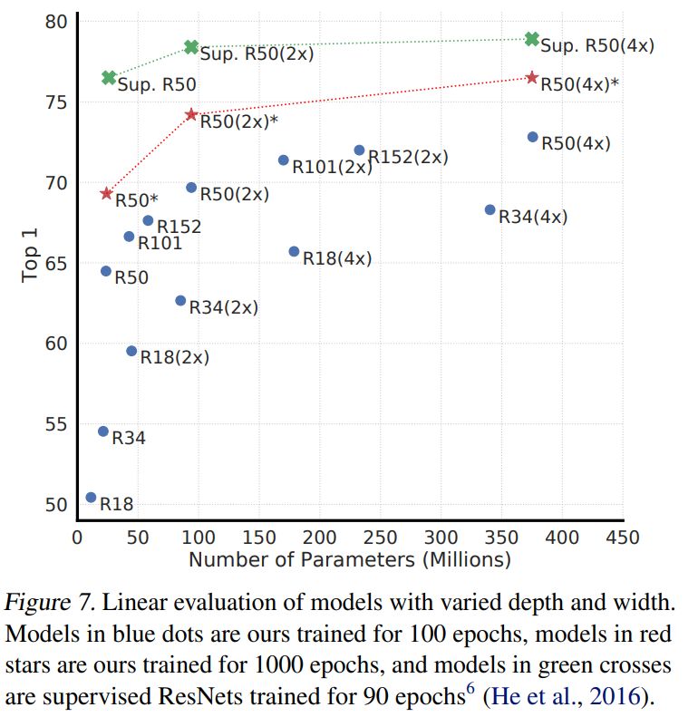 如图 7 所示,增加深度和宽度都可以提升性能。监督学习也同样适用这一规律。但我们发现,随着模型规模的增大,监督模型和在无监督模型上训练的线性分类器之间的差距会缩小。这表明,与监督模型相比,无监督学习能从更大规模的模型中得到更多收益。