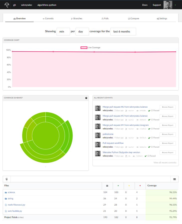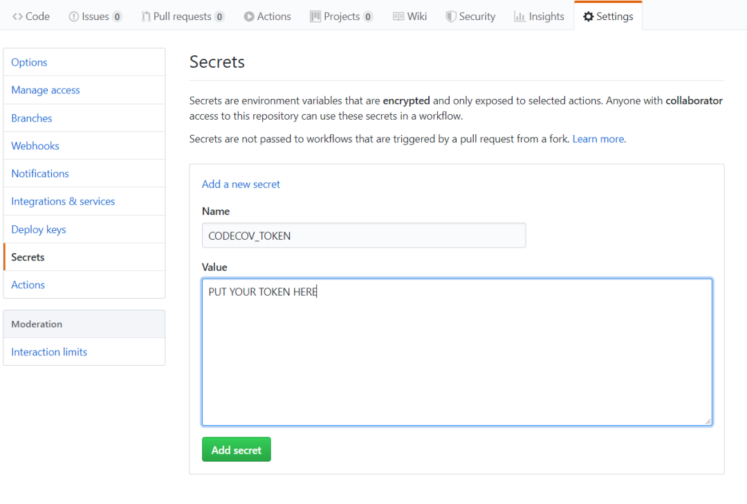 最终,生成的测试覆盖率报告可以上传到Codecov(Upload coverage to Codecov)。在这里我们使用uses: codecov / codecov-action @ v1(https://github.com/marketplace/actions/codecov)。在其中,我们提供3个参数:token: ${{ secrets.CODECOV_TOKEN }},取值自我们放置在GitHub Secrets保管库的文件,(之前的步骤生成的)测试覆盖率报告的位置是file:./coverage.xml,而flags:unittests是对我们的单元测试进行分组的标志。