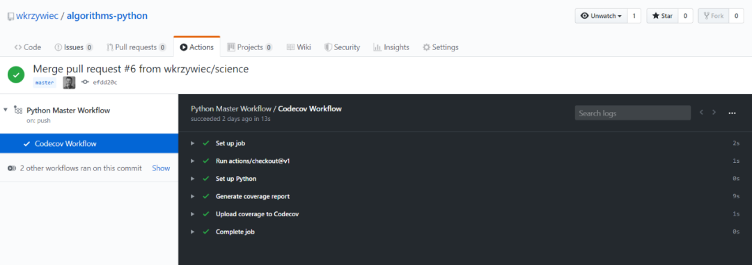 为了测试它的运行,你需要创建一个新的branch,提交一些更改并将其推送到GitHub。然后创建一个pull request,就能触发此工作流了。要检查它,请转到项目中的“Actions”选项,如果一切顺利则应如下图所示: