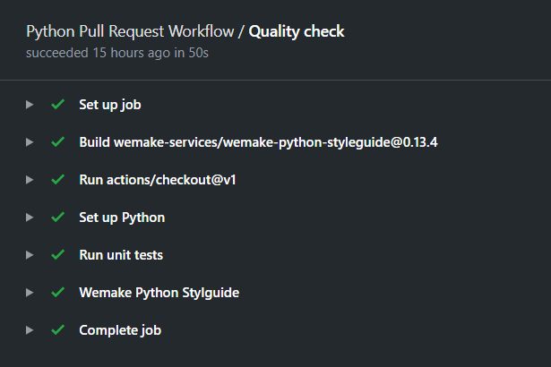 name: Python Pull Request Workflowon: [pull_request]jobs:qa:name: Quality check: ubuntu-18.04steps:uses: actions/checkout@v1name: Set up Pythonuses: actions/setup-python@masterwith:: 3.8name: Run unit testsrun: |pip install pytestpytestname: Wemake Python Stylguideuses: wemake-services/wemake-python-styleguide@0.13.4: truewith:reporter: 'github-pr-review'env:GITHUB_TOKEN: ${{ secrets.GITHUB_TOKEN }}