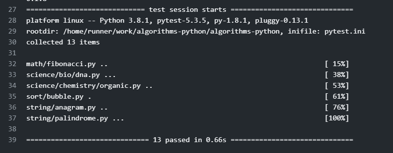 Run unit tests将运行位于项目中的所有单元测试。为此,我使用的是pytest,首先需要安装pip install pytest,以便可以运行下一个命令pytest。如果这一步上有任何一个测试失败,则下一个测试将不会运行。