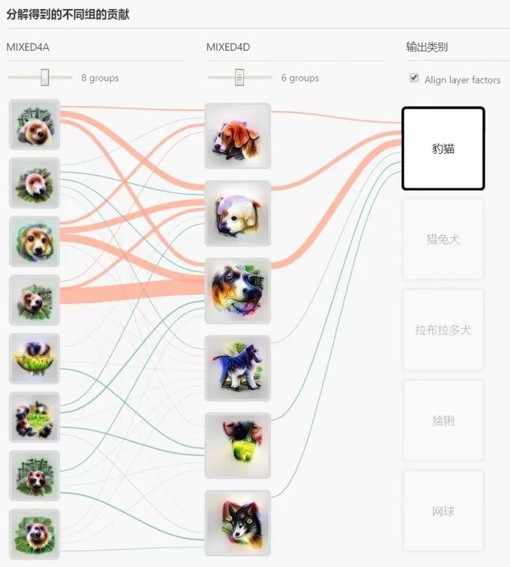 也许最有趣的是,这个界面允许我们交互式地查看隐藏层之间的归因。悬停时,额外的显著图会遮盖隐藏层,这在某种意义上就相当于「将光线照入黑箱」。这种层到层的归因或许将成为界面设计促进传统意义上可解释性抽象概括的一个主要例子。