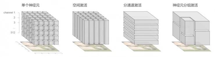 图中用于计算机视觉任务的神经网络的不同的隐含层如何组成了激活值的「立方体」。对立方体的不同分割方法可以把激活值具体到单个神经元、单个空间位置或者单个通道