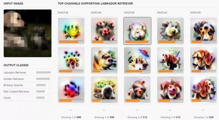 在这篇文章中,作者们把现有的各种可解释性方法看作基础的、可以相互组合的基础结构,在它们基础之上构建丰富的用户界面。他们发现这些互相独立的技巧也能够以统一的形式组合起来,在最后得到的界面中发挥补充性作用。更重要的是,这种统一的形式可以让我们系统地探索可解释性界面的整个空间,让我们得以评估它们是否达到了特定目标。下文中将展示各种样式的界面,从中展示网络检测发现了什么,并且解释网络对物体的理解是如何逐步生成的,同时还把其中涉及到的信息保持在适合人类理解的尺度下。比如,我们将会看到一个看到了拉布拉多犬的网络是如何检测它软塌塌的耳朵的,以及这种检测行为是如何影响网络的分类结果的。