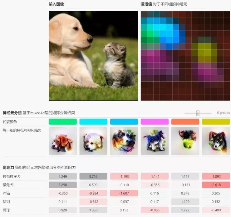 通过非负的矩阵分解,作者们把总数目很大的神经元分为一个个小组,让它们简明地总结出整个网络的运行状况。右图小方块的不同颜色对应了下方不同的特征分别占不同空间的激活值的主要成分