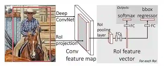 一年以后,Ross Girshick(微软亚洲研究院)发表了Fast R-CNN,这个方法迅速演化成一个纯深度学习的方法。与R-CNN相似,它也使用选择性搜索来生成候选区域,但与R-CNN不同的是,Fast R-CNN在整张图上使用CNN来提取特征,然后在特征图上使用区域兴趣池化(Region of Interest,ROI),并且最后用前馈神经网络来进行分类和回归。这个方法不仅快,而且由于RoI池化层和全连接层的存在,该模型可以进行端到端的求导,并且训练也更容易。最大的不足是该模型仍旧依赖选择性搜索(或者其他的区域候选算法),这也成为了模型推理阶段的一个瓶颈。