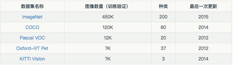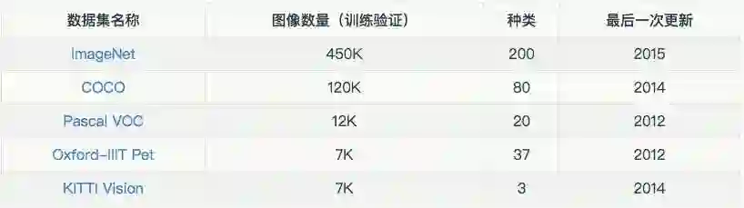数据集名称 图像数量(训练验证) 种类 最后一次更新ImageNet 450K 200 2015COCO 120K 80 2014Pascal VOC 12K 20 2012Oxford-IIIT Pet 7K 37 2012KITTI Vision 7K 3 2014
