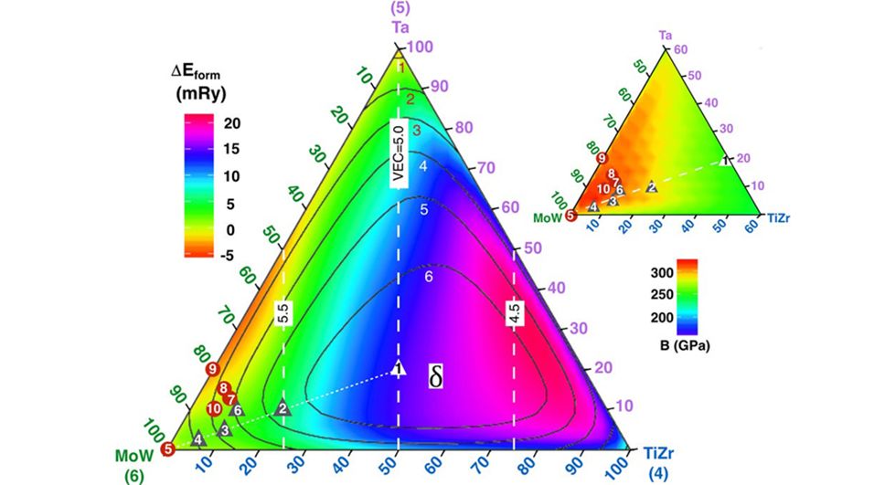 镍基高温合金和含钼近等原子高熵合金都具有较高的温度强度和耐腐蚀性。但要设计复杂的固溶合金空间巨大。美国爱荷华州立大学Duane Johnson教授等用密度泛函理论研究了由五种难熔元素(钼、钨、钽、钛和锆)构成的设计空间,确定了用于冶炼高温强度和耐腐蚀性富钼合金的最佳组分。他们将第一性原理计算与电子合金设计标准相结合,通过相干势近似来展示KKR电子结构方法,以便在五维设计空间上鉴定合金,改进其力学性能和必要的全局(形成焓)和局部(短程有序)稳定性。通过预测杨氏模量、短程原子有序等结构性质,以晶格常数确定每种组份的整体稳定性、快速筛选设计空间以选择出合金的最佳组分。所预测的、稳定性得到改善的复合固溶体合金,比近等原子情况下弹性模量大大提高(在300 K时提高3倍,与实验验证结果一致),温度在500 K以上时的合金弹性模量也比商业合金温度为2000 K时的模量要高2.3倍。作者的研究还表明,鉴于关键的电子效应,最佳复合固溶合金不能用经典势函数很好地描述。他们的方法还可用来优化其他复杂固溶合金以提高其力学性能。该文近期发表于npj Computational Materials 4:16 (2018); doi:10.1038 /s41524-018-0072-0。英文标题与摘要如下,点击阅读原文可以自由获取论文PDF。