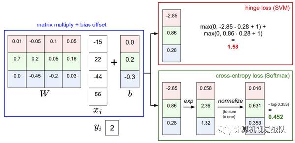 针对一个数据点,SVM和Softmax分类器的不同处理方式的例子。两个分类器都计算了同样的分值向量f(本节中是通过矩阵乘来实现)。