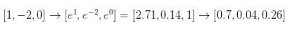 举个例子,假设3个分类的原始分数是[1, -2, 0],那么softmax函数就会计算:
