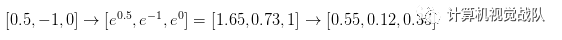 这样算出来的分数也会更小,假设小了一半吧[0.5, -1, 0],那么softmax函数的计算就是: