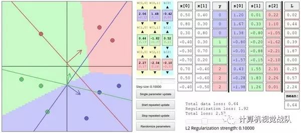 我们实现了一个交互式的网页原型,来帮助读者直观地理解线性分类器。原型将损失函数进行可视化,画面表现的是对于2维数据的3种类别的分类。原型在课程进度上稍微超前,展现了最优化的内容,最优化将在下一节课讨论。