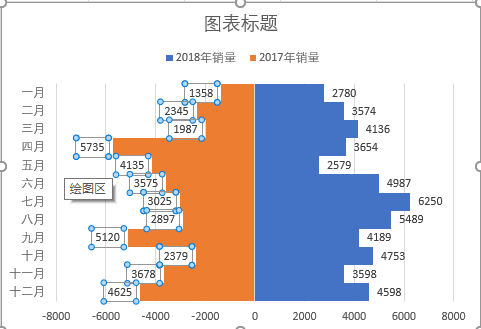 右键单击图表区域,”选择数据“设置框中,把”2017年销量”系列上移;