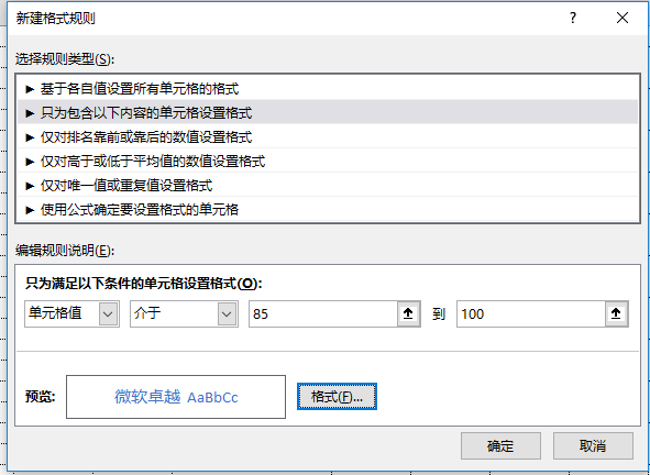(2)弹出的窗口,选择“新建格式规则”下的“只为包含以下内容的单元格设置格式”,选择“介于”,“85-100”,“格式”下选择蓝色,确定;
