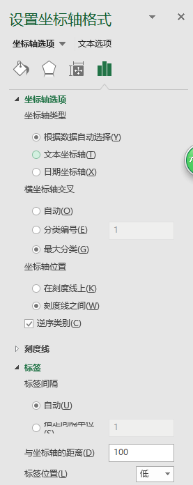(4)设置坐标轴格式,“横坐标轴交叉”选“最大分类”,“逆序类别”前打勾,“坐标轴标签”选“低”,确定后效果如图;