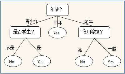 以下面一个简单的用于是否买电脑预测的决策树为例子,树中的内部节点表示某个属性,节点引出的分支表示此属性的所有可能的值,叶子节点表示最终的判断结果也就是类型。