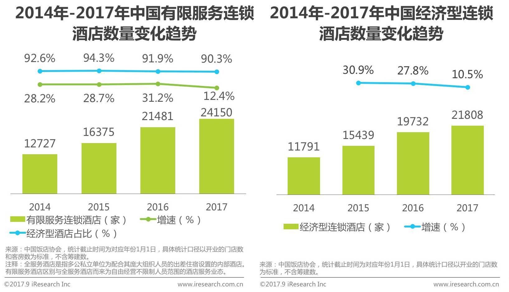 截止至2017年1月1日中国有限服务连锁酒店门店数量达到24150家,相较于2016年1月1日仅增长12.4%,增速大幅降低。在全国有限服务连锁酒店中,2017年经济型酒店门店数为21808家占比90.3%,相较去年略有降低,仍为中国连锁酒店主要构成者。