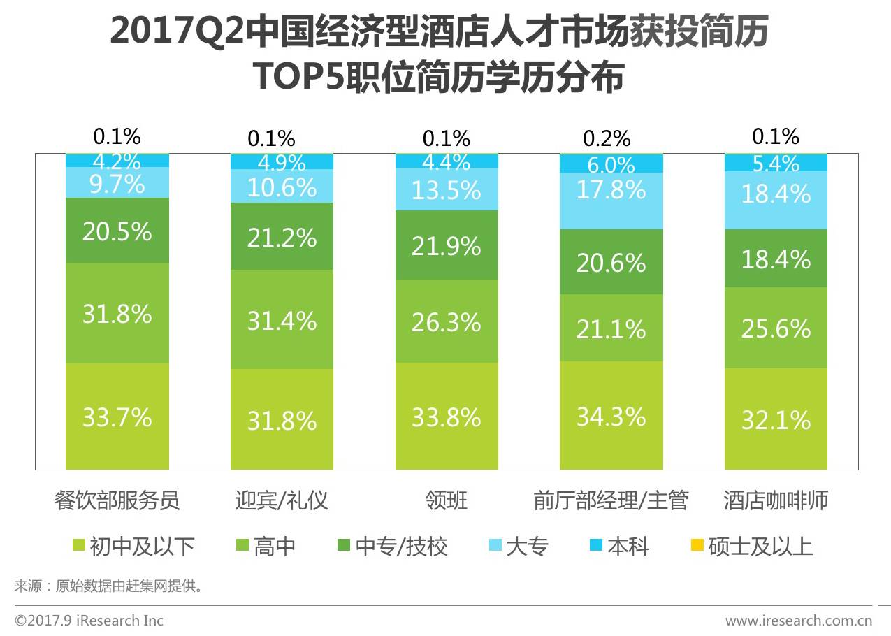 根据赶集网历史数据,2017Q2获投简历TOP5职位分别为餐饮部服务员、迎宾/礼仪、领班、前厅部经理/主管和酒店咖啡师。在这些职位中,获投简历为初中及以下学历均占比最高。此外,横向对比TOP5职位不同学历占比情况发现,获投简历数量与简历学历成负相关,获投简历越多的职位,求职人员学历越低,反之获投简历相对越少的职位,求职人员的学历越高。