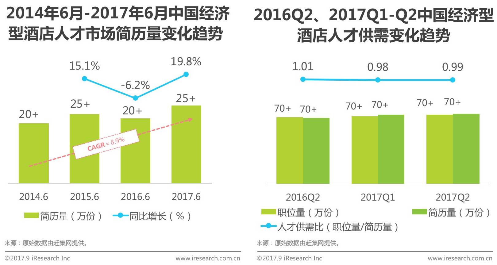 根据赶集网年度历史数据,2017年6月中国经济型酒店人才市场简历量近30万份,相较于2016年6月同比增长19.8%。而对比历年数据情况,2014年6月到2017年6月,人才市场简历量年复合增长率为8.92%,行业求职人才数量持续增多。
