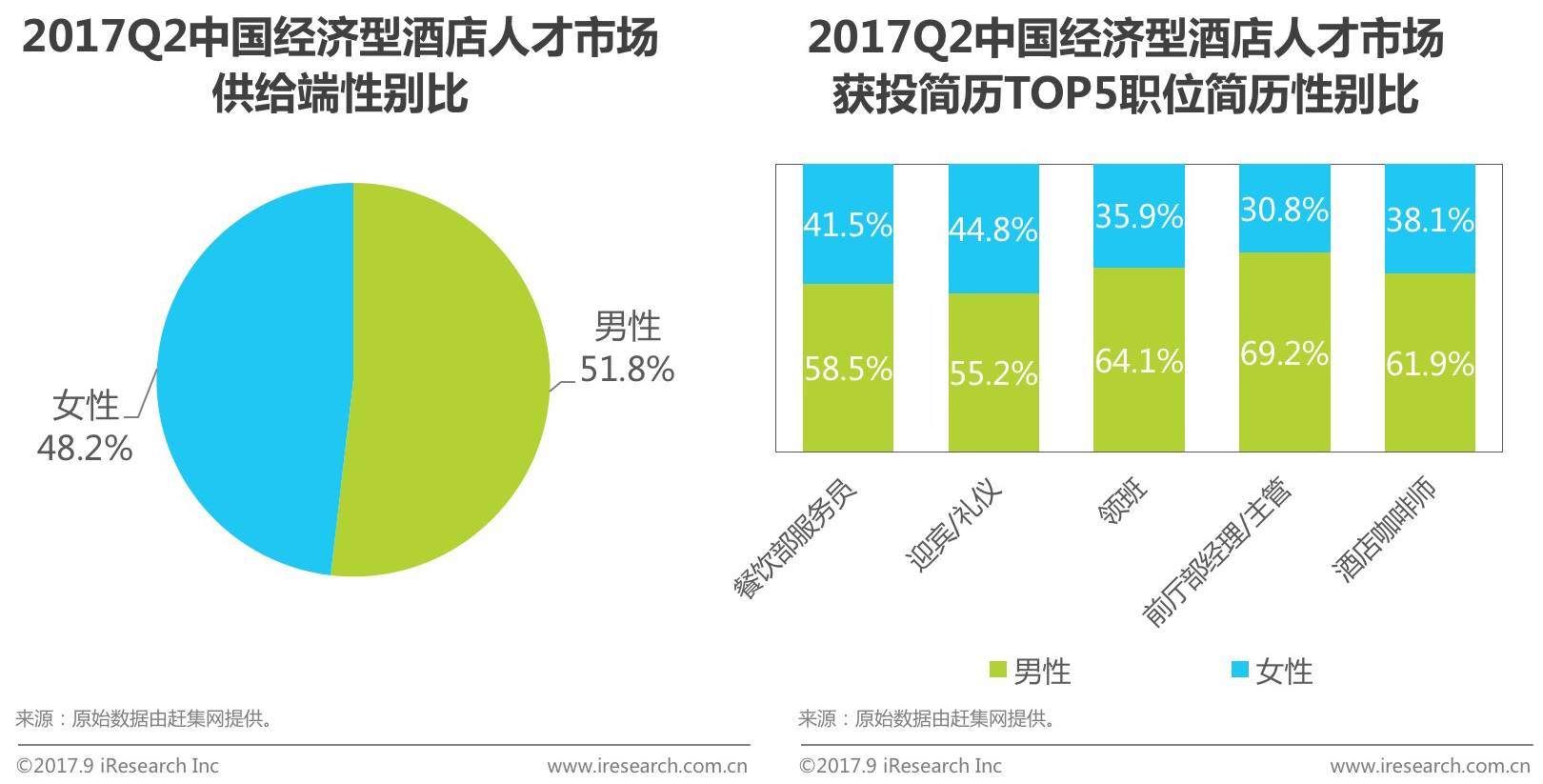根据赶集网历史数据,2017Q2中国经济型酒店人才市场供给端,求职人员性别占比分别为男性占比51.8%,女性占比48.2%,整体人才性别占比基本均衡。但对比在2017Q2获投简历量TOP5职位,迎宾/礼仪中女性求职者最多,而男性求职者最多的职位则是前厅部经理/主管。在获投简历最多的TOP5职位中,男性求职者占比均高于女性。