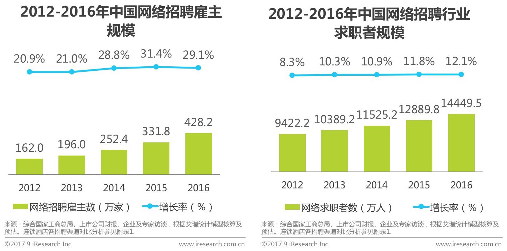 艾瑞数据显示,一方面2016年网络招聘行业雇主数量不断增加达到428.2万家,另一方面网络求职者数量也不断增加,达到1449.5万人,而同时雇主数量和网络求职者数量分别保持了29.1%和12.1%的增速,网络招聘渠道的渗透率将进一步提高。而对于经济型酒店人才市场来说,随着互联网用户渠道下沉和普及率的提升,未来基层服务求职人员对于网络招聘的使用将成为常态,网络招聘渠道的重要性不断提升。