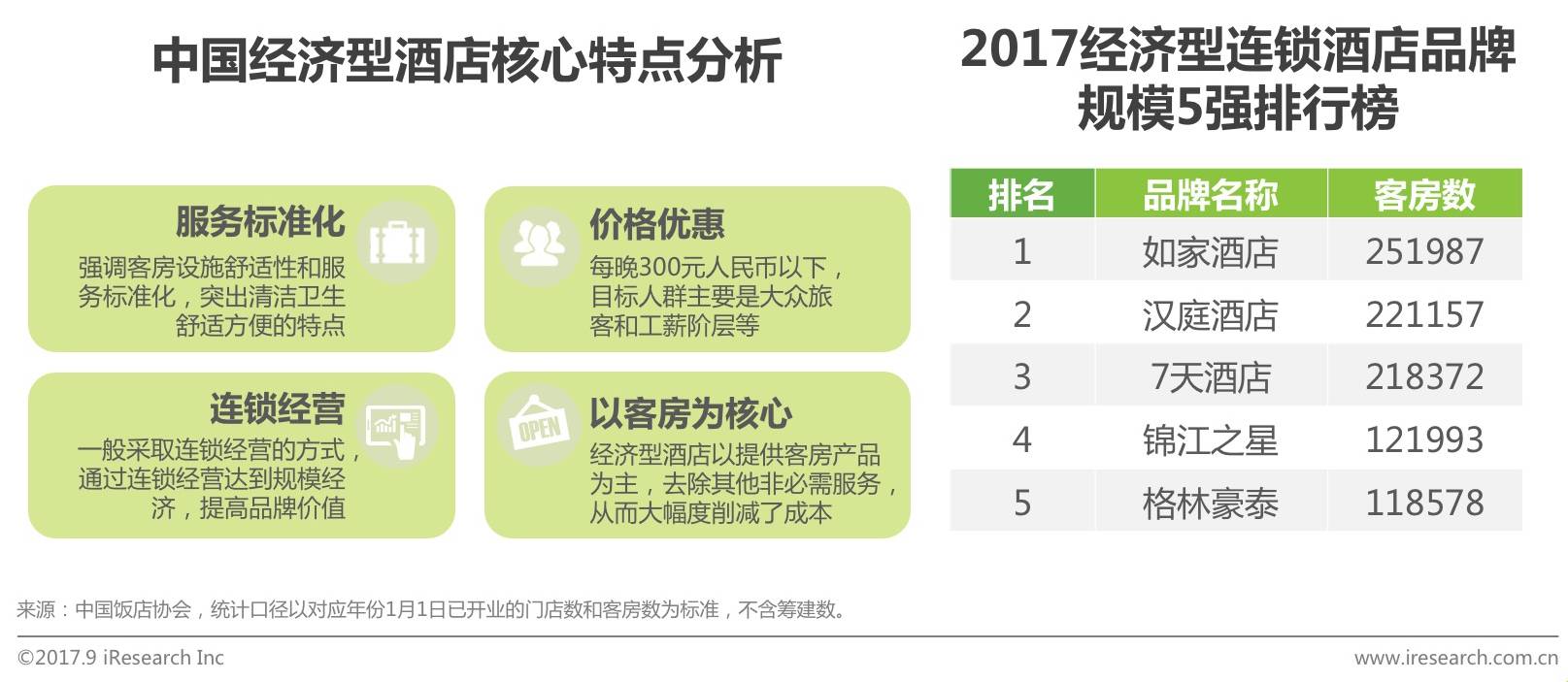 经济型酒店:是指以客房为核心产品,并且不超过三星级酒店标准的消费水平(每晚300元人民币以下),通过统一品牌与连锁化规模经营(两家门店以上)严格控制成本,为用户提供标准化住宿和餐饮服务的现代酒店业态。代表企业包括如家酒店、汉庭酒店、7天酒店、锦江之星、格林豪泰等。