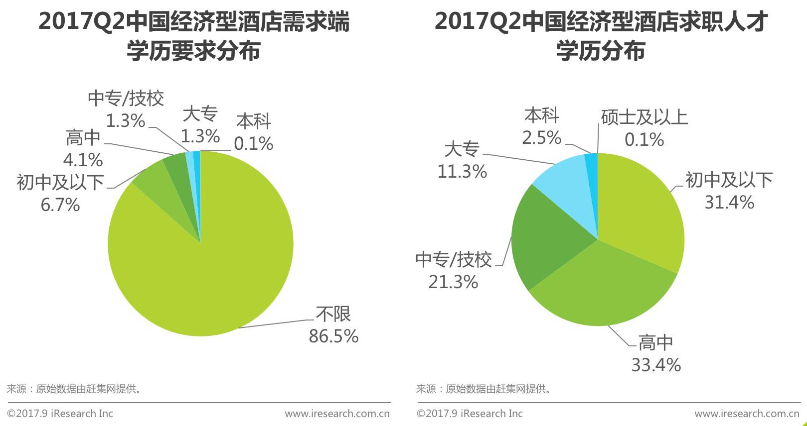 根据赶集网历史数据,2017Q2中国经济型酒店人才市场发布的职位中,不限学历的职位比例高达86.5%,初中及以下占比6.7%,高中及以上总占比仅为6.8%,而对比求职人员的学历情况,初中及以下占比31.4%、高中占比33.4%、中专/技校占比21.3%、大专占比11.3%,从整体来看,中国经济型酒店人才市场需求端对学历要求较为宽松,而供给端求职人员学历情况远超预期。