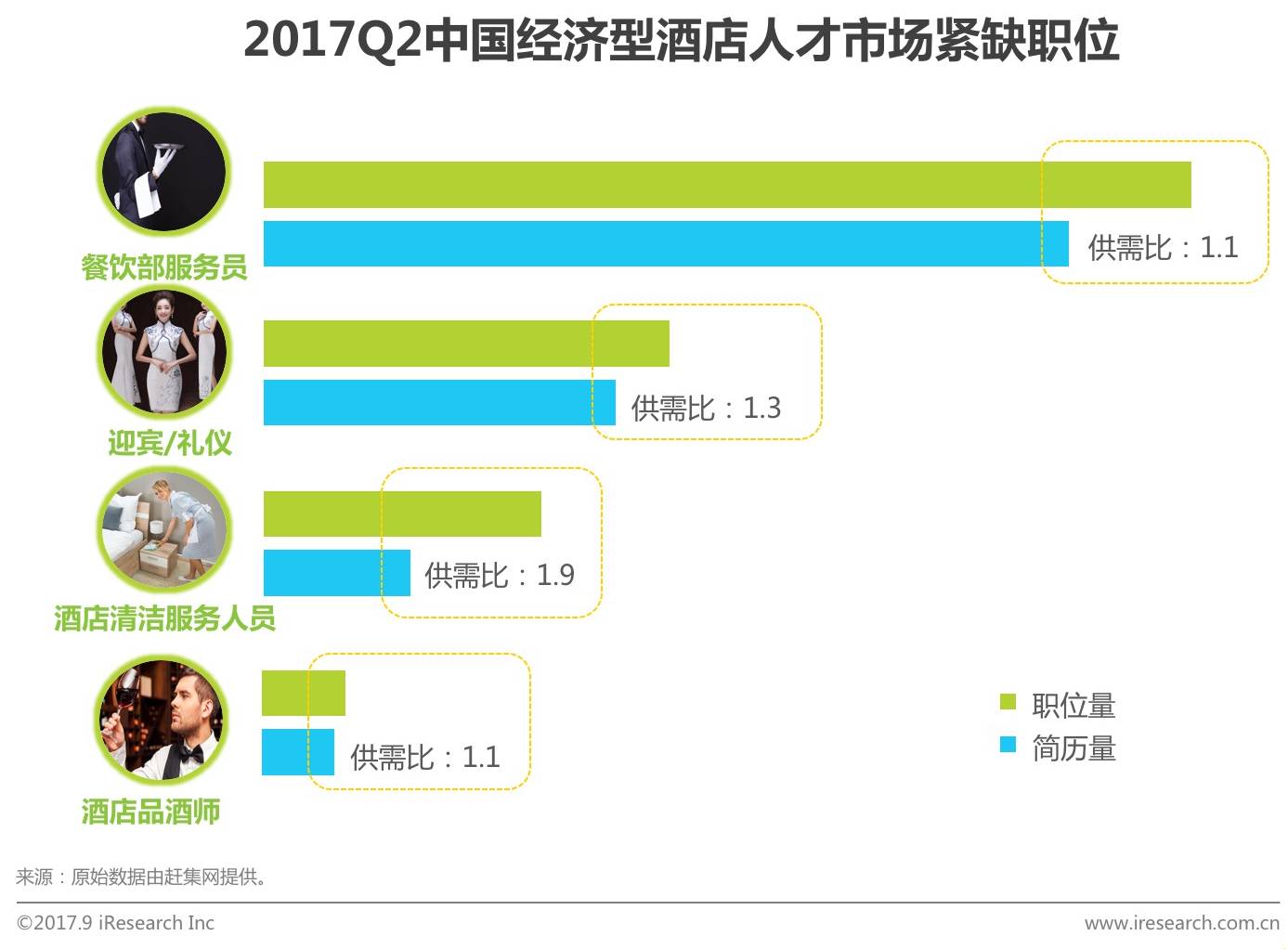 根据赶集网历史数据,2017Q2中国经济型酒店人才市场紧缺职位(职位量>简历量)有餐饮部服务员、迎宾/礼仪、酒店清洁人员和酒店品酒师,各职位的人才供需比分别为1.1、1.3、1.9和1.1,行业中酒店清洁服务人员的需求最为紧张。