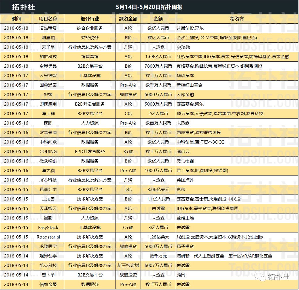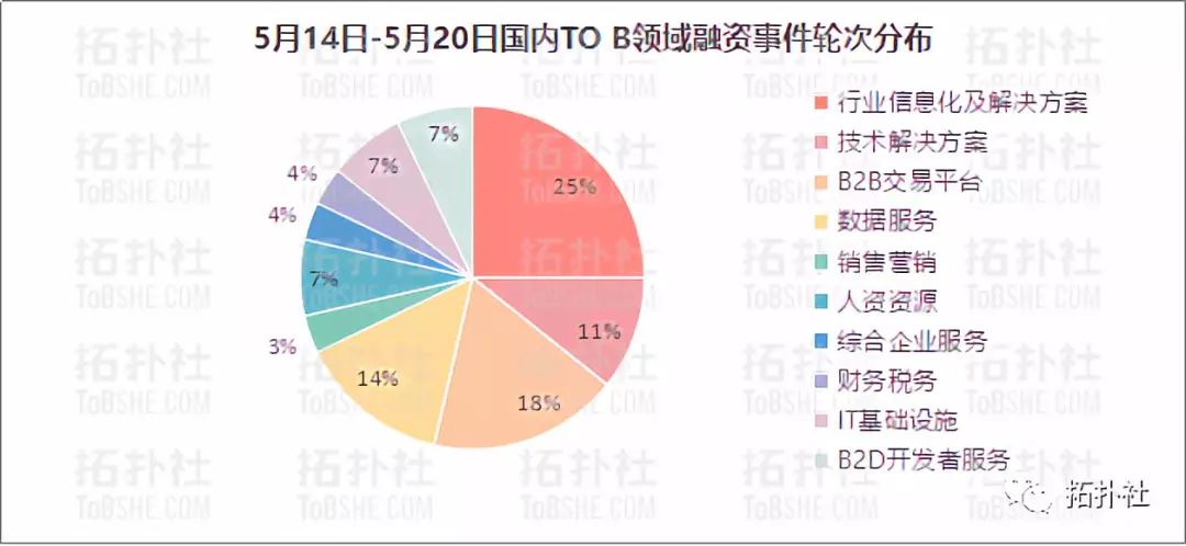 在 5 月 14 日-5 月 20 日这一周里,拓扑社总共追踪到 to B 领域 28 起投资并购事件,披露金额累计约 45.54 亿元人民币。