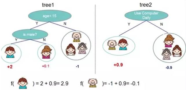 下图,左右两个决策树,单个看是效果不怎么好的,但是把同样的数据投入进去,把两个结果加起来考虑,就会增加可信度。