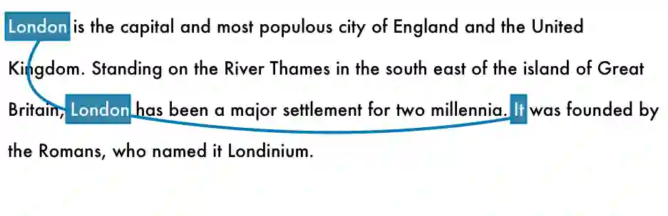 根据NLP pipeline,我们的模型只知道“it”是罗马人造的,还不知道“it”是什么。但这个问题想必难不倒任何读得动这段话的人,我们知道这里的“it”就是第一句里的“London”。