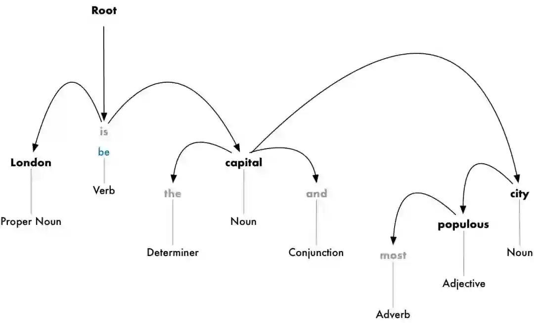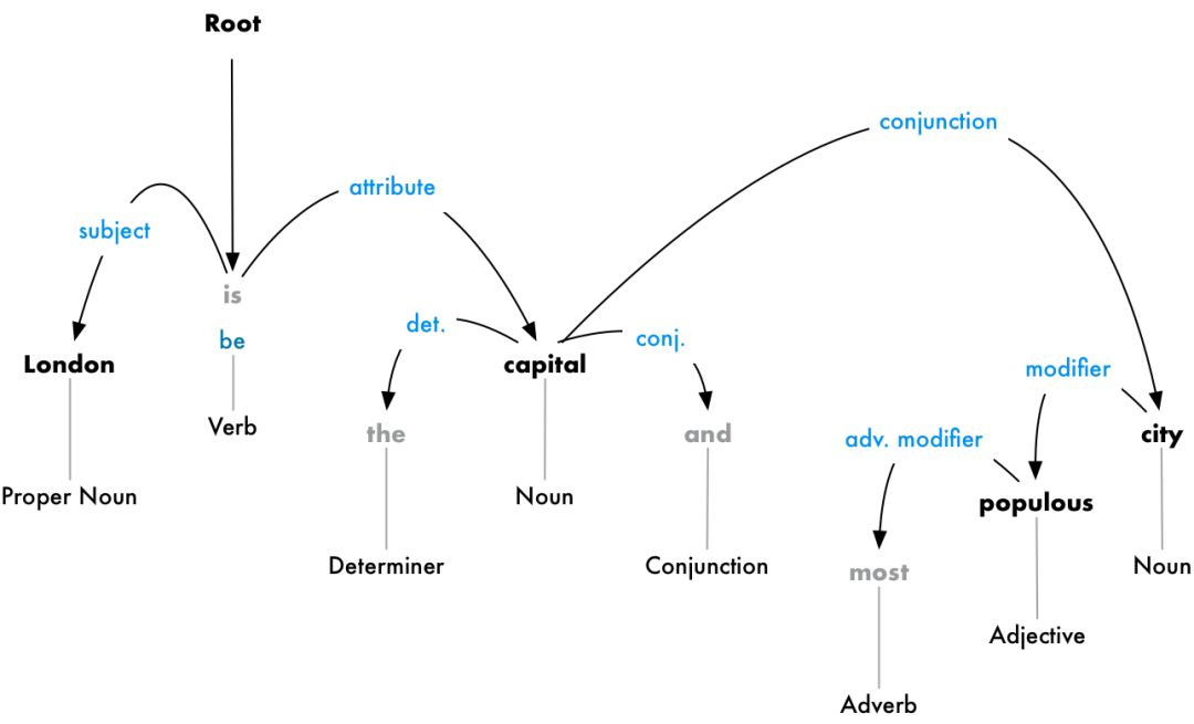 这棵依存树告诉我们句子的主语是“London”,它和“capital”存在一个“be”的关系。据此我们得到了一条有用信息——London is a capital。在这个基础上,如果我们继续往后看,可以发现,其实London is the capital of the United Kingdom。