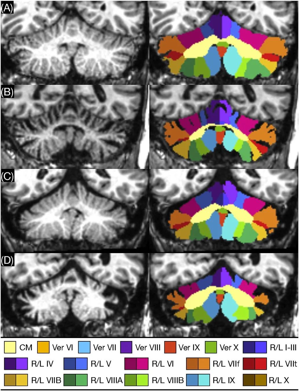 图4)通过级联深层网络方法进行脑结构分割。来自于A)健康受试者;B)脊髓小脑共济失调(SCA)2型;C)SCA 3型;D)SCA 6型受试者。