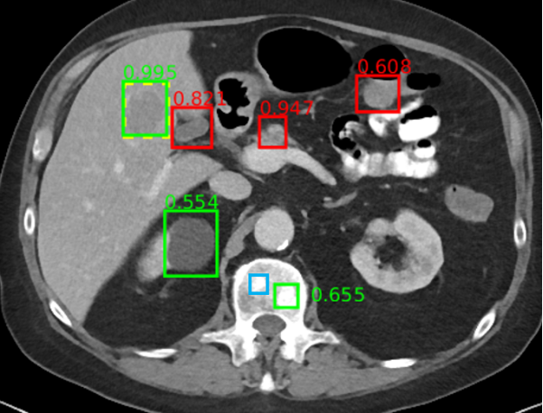 图6)腹部CT的通用病变检测。在此上腹部的轴向图像中,以高置信度正确检测(见绿色框)到肝脏病变(0.995),还正确检测到肾囊肿(0.554)和骨转移(0.655)。误报(见红色框)包括正常胰腺(0.947),胆囊(0.821)和肠(0.608)。遗漏了微妙的骨转移(见蓝色框)。