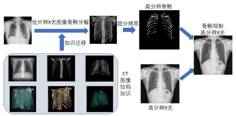 图2)将学习到的CT图像域结构知识迁移用于X光影像增强。