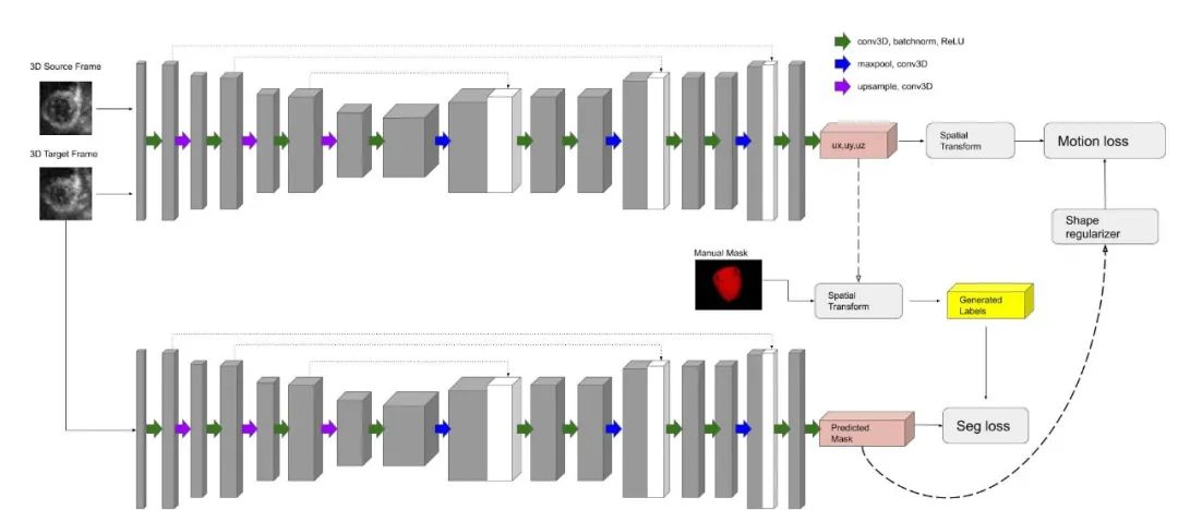 图5)上:心脏运动跟踪+分割联合建模的四维两通道CNN架构; 下:左=位移场;右=左心内膜(红色)和心外膜(绿色)的轮廓线。