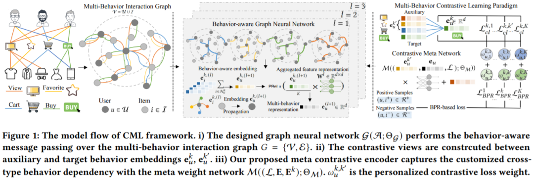 在CML框架中采用一种多行为对比学习范式,通过自监督原则捕捉不同类型用户交互的复杂依赖关系。该对比学习框架利用来自辅助行为的辅助监督信号促进主要的监督任务(即目标行为预测)。