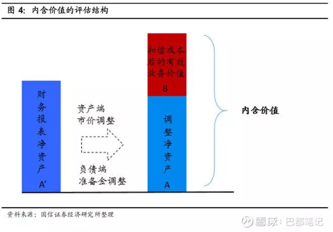 从会计准则下的净资产调整而来,经过两个步骤:(1)资产端,将资产价值调整为市价;(2)负债端:将会计准则下的保险合同准备金调整为内含价值体系下法定准则的准备金。两者影响是反向的。