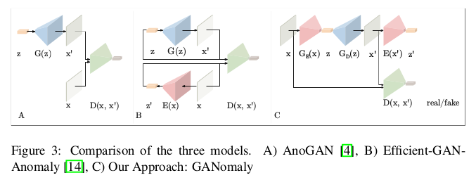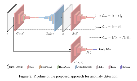 异常检测的发展在深度学习的浪潮下得到了很快的发展,基于 CNN,RNN、LSTM 技术上已经取得了一定的成效。随着 GAN 的提出,对抗的思想越来越引人注意,利用 GAN 做异常检测的文章在实验上有了一定的突破,从 AnoGAN [1] 学习到正常样本的分布,一旦送入异常样本数据发生改变从而检测出异常,这种方法的局限性很强,往往也会带来计算成本的昂贵(需要严格的控制先验分布 z)。在此基础上,为了找到更好用作生成的先验分布 z,在 AnoGAN 的基础上提出了 Efficient-GAN-Anomaly [2] 同样由于做个一次重新映射导致计算成本上也是庞大的。