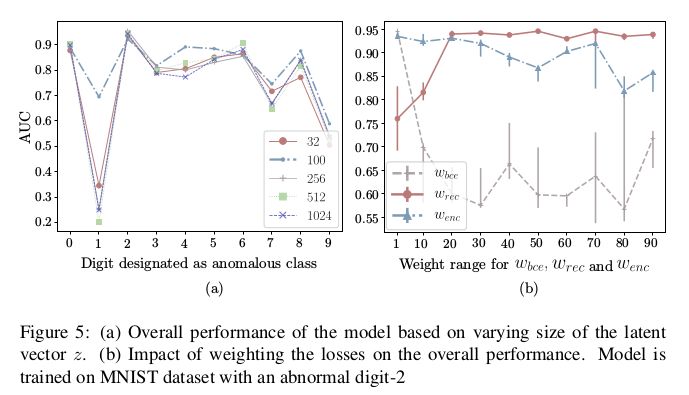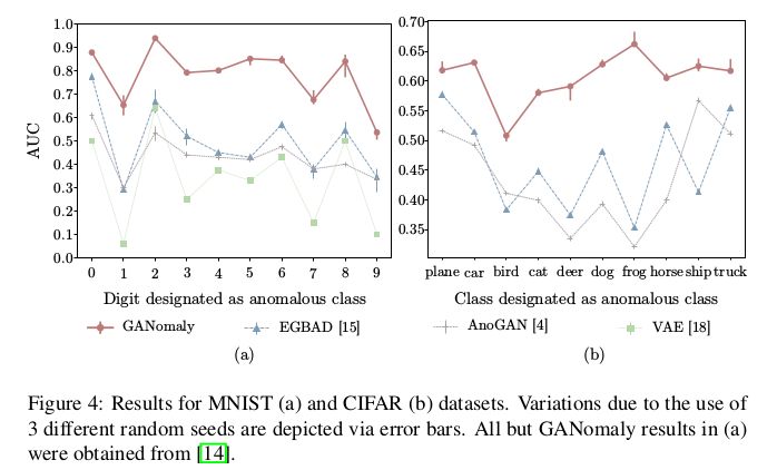 实验在 MNIST,CIFAR10 上选取部分类别做正样本,选取一些类别作异常样本,测试模型是否能够检测出异常样本并给出准确率。文章的衡量标准是以 AUC 为判断。实验对比了三种以 GAN 做异常检测的模型以及 VAE 的结果,通过 AUC 分析可以看出 GANomaly 取得了不错的优势。