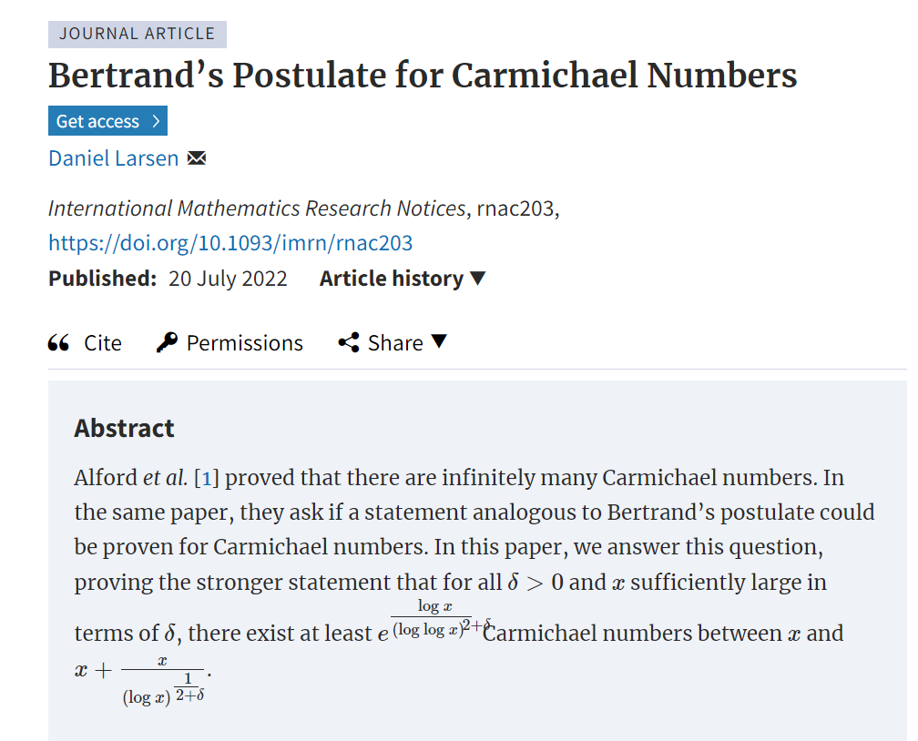 Larsen 想了解 Maynard 和陶哲轩研究背后的数学原理,不过 Larsen 发现他们的论文太复杂了,他试图阅读相关的作品,却发现这些也难以理解。Larsen 一直在坚持,直到 2021 年 2 月,他发现了一篇他认为既漂亮又易于理解的论文,主题是:卡迈克尔数,这些奇怪的合数有时会伪装成素数。