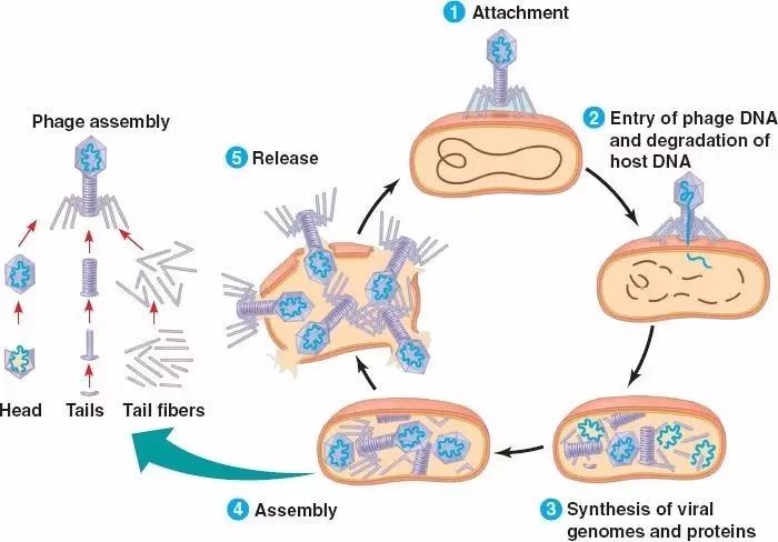 噬菌体一般有个大大的头,这个头的外壳是蛋白组装的,里面有遗传物质DNA。噬菌体还有一条尾巴和几只触角,靠触角先吸附在细菌上,再用尾巴在细菌的壁膜打个洞,然后DNA通过尾巴注入细菌。进入细菌的噬菌体DNA利用细菌的资源组装下一代噬菌体,等资源利用得差不多了就把细菌搞破裂,把下一代的噬菌体释放出去,寻找下一个冤大头细菌。下面这个图就是噬菌体的一个生活周期,简单一点表达,就是一个噬菌体钻进去,一群噬菌体放出来;一个细菌倒下去,成百上千的细菌接着遭殃。在人体里猖狂得不可一世的细菌,在噬菌体面前就是一个任之饕餮的倒霉蛋。