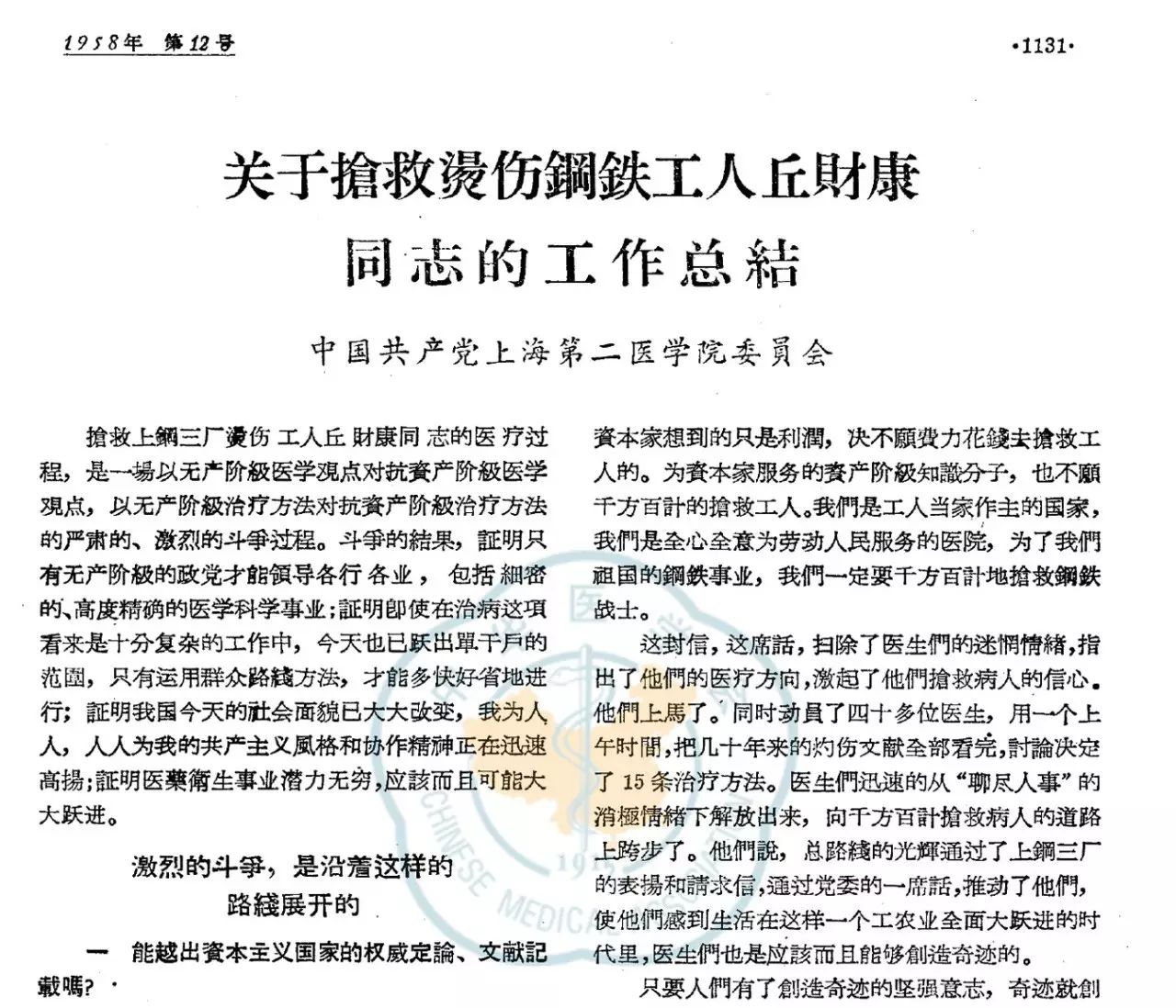 事情发生在1958年。那个时候,中国人还没有富得满世界乱跑、败家、购物。全中国在那时忙着大跃进、大炼钢铁。这个病人是一个炼钢工人,应该还是劳动模范,有可能是安全防范措施没有做好,总之是炼钢的时候出了事故,被1300度高温的钢水烧伤了。